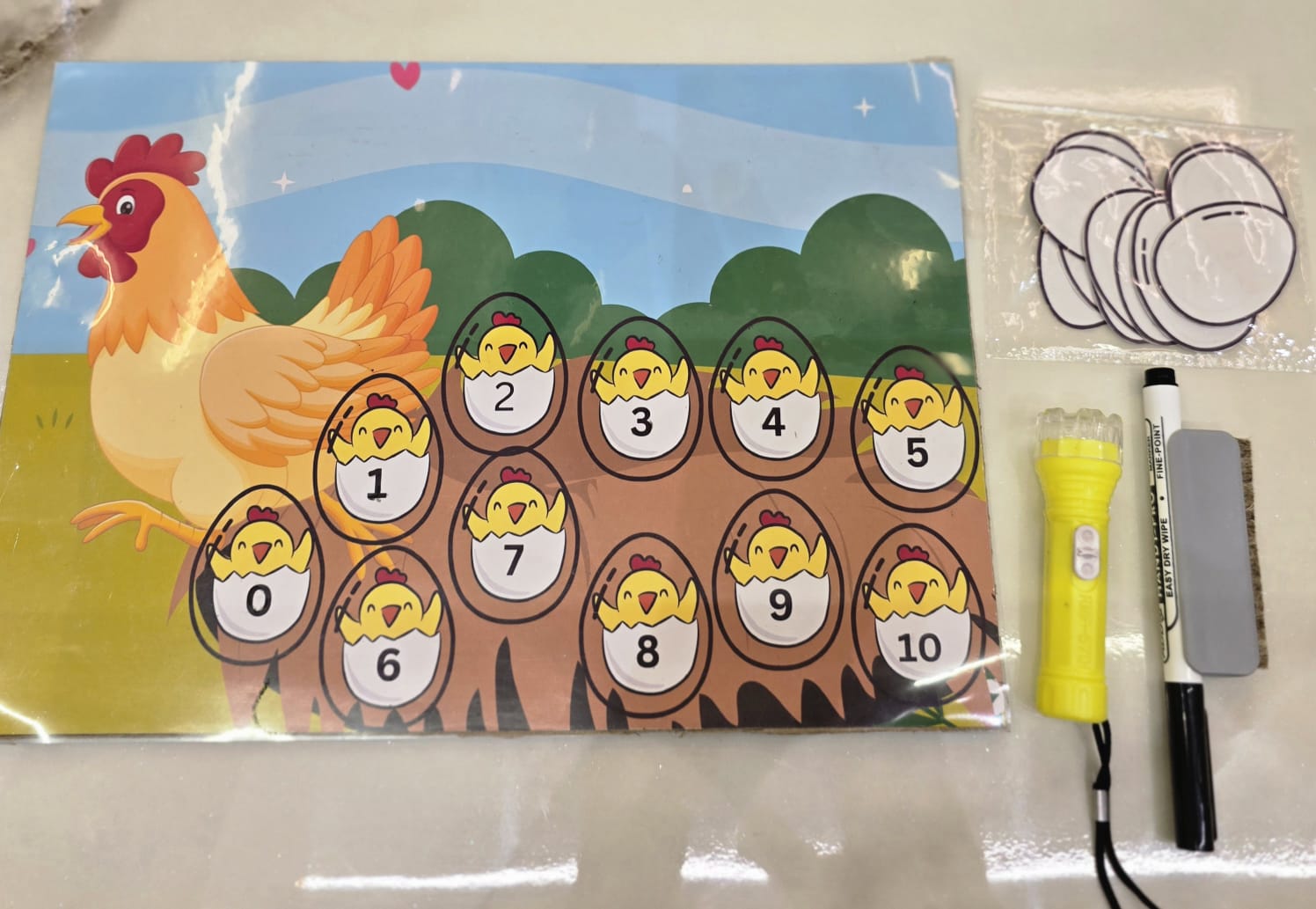 š§ Fun, Screen-Free Learning! The Hatch the Eggs ā Number Game is a joyful hands-on activity for toddlers aged 2ā5 years. š„ Shine the torch to reveal numbers hidden inside eggs, match them, and practice writing! āļø Rewritable egg board (0ā10) āļø 11 hidden-number chick cards āļø 1 marker pen āļø 1 flashlight for discovery play ā Builds number sense ā Improves fine motor skills ā Eco-friendly & reusable